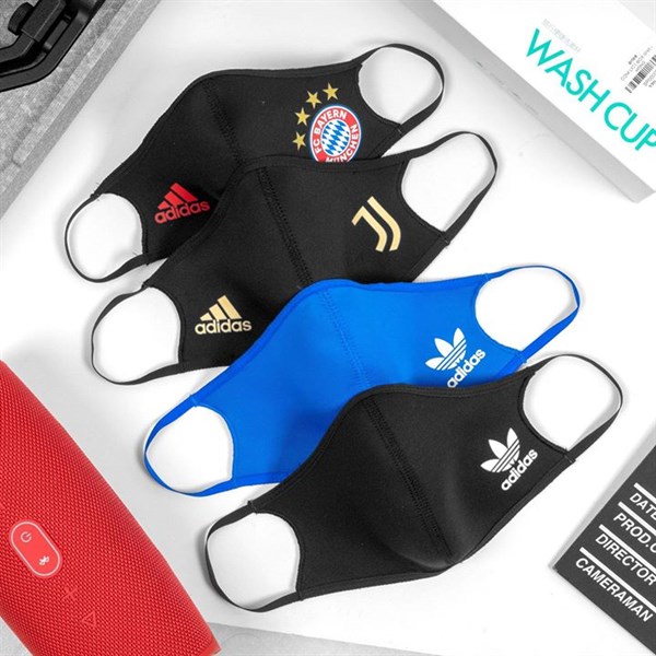 Có thể giặt sạch và sử dụng lại nhiều lần. Logo và dòng chữ A.di.das màu trắng được in nổi bật ở góc trái bên dưới khẩu trang tạo điểm nhấn.
